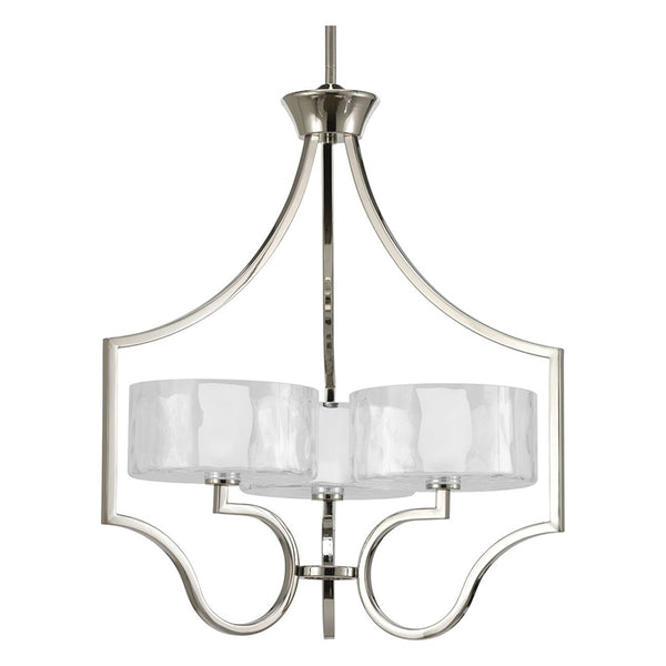 Three-light chandelier. Caress features a chic, sophisticated three-light chandelier featuring a Polished Nickel metal frame with layered glass diffusers to cast a glimmering light. An outer shade of clear, water glass adds rich texture and playful reflections from a central etched glass diffuser.