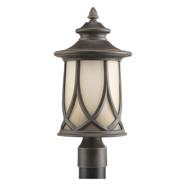 Tudor styling meets prairie design. Gradual umber tint on glass shades. A woven cast pattern encases a casual profile. Large scale cast aluminum lantern feature a durable powder coat finish. One-light post lantern.