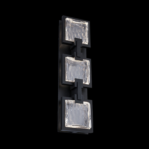 A legend in its own time, the Pop Star medium outdoor wall light thrives on performing. Three squarepanels edge-lit by LED are secured by sleek metallic accents against a rectangular aged brass backplate. Finished with a weather-resistant powder coat, this piece is built to command attention, rain or shine.