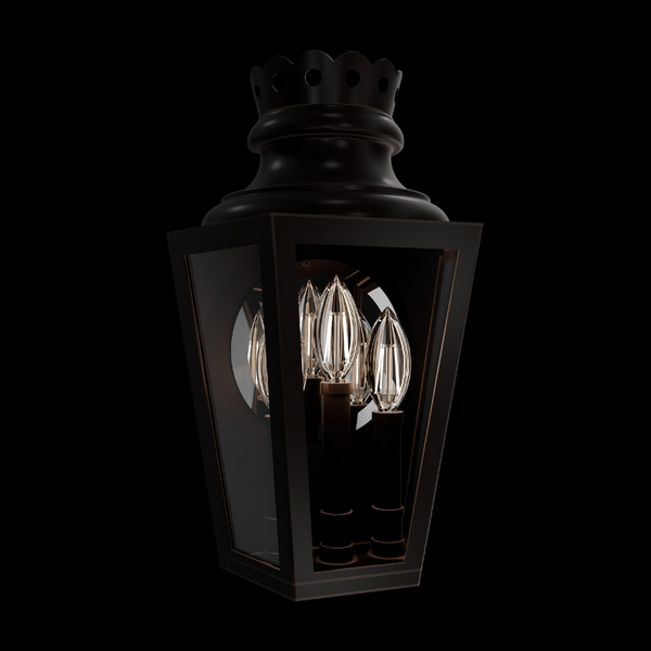 The Betony small outdoor wall lantern redefines tradition with a gracefully tapered form, finished in weathered zinc oxide for a rich, understated depth. A stylized crown accents the roofline, adding a touch of elegance to the classic silhouette. Clear, polished glass panels encase the design, showcasing a trio of candlesticks at its center.
