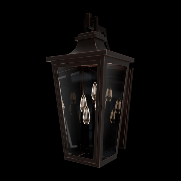 The Dannemore medium wall lantern combines timeless elegance with modern sensibility. Its tapered metal frame is crowned with a curved, pyramid-like top, creating a refined silhouette. Clear glass panes encase candles, casting radiant illumination across your outdoor space.