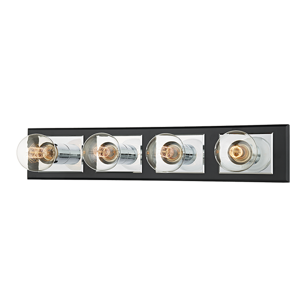 Paying homage to the mirror lights of a bygone Hollywood era, Runyan gives the bath an instant upgrade. Thick, stamped metal plates in Patina Brass or Polished Nickel rest on larger rectangular plates in Soft Black creating a glamorous two-tone look. Beveled sides on the plates add sophistication and elevate the design. Customize the look with one-, three-, four- and five-light options that can be mounted vertically or horizontally.
