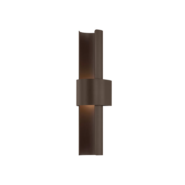 An industrial-modern sconce with graphic appeal, Ossian combines smooth curves and an allover Bronze materiality to create an edgy exterior staple. Its tubular shape creates a unique C-shaped channel that is intersected by a wide belt at the center, concealing the light source. As the channel fills with light, this graphic sconce casts an ambient glow around an outside area.