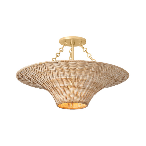 Hand-woven from natural wicker, Ketan puts a playful spin on a design inspired by Charlotte Perriand. The inverted trumpet shape of this semi-flush emits both up and downlighting, with the exposed bulb casting a powerful beam. Completing the fixture's fresh appearance is a simple chain and canopy cast in Vintage Gold Leaf.