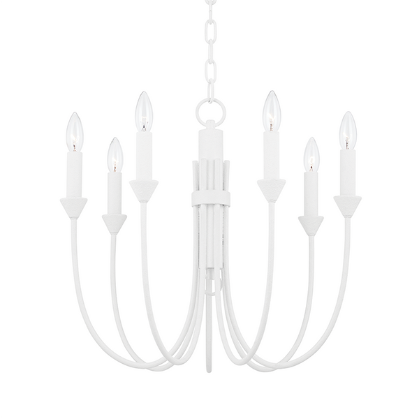 Cate's large swooping arms give the piece a presence while still feeling open and airy at the same time. Whether as a simple single sconce or a breathtaking18-light chandelier, each smooth arm holds a solitary bulb that emits a warm glow. Make a bold statement in Forged Iron or keep things beautifully clean in White Gesso.