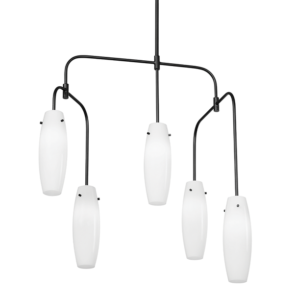 A modern masterpiece, Cyan takes mobile-inspired design and moves it to the next level. Sleek, rounded arms at asymmetrical lengths and elongated shades combine to create a silhouette that is sure to be the centerpiece of any room. Opal glossy shades add touch of glamour and are the perfect complement to the Soft Black finish.