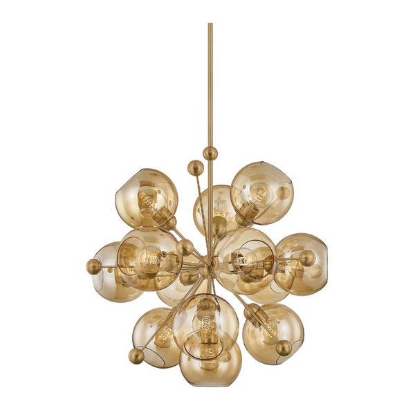 Drawing inspiration from the dynamic energy of mid-century modernism, Ellory’s specialty glass updates a timeless Sputnik silhouette. The expressive composition features a cluster of light bronze glass shades that burst from a Patina Brass frame. Smaller ornamental metal spheres add pizzazz to the maximalist array.