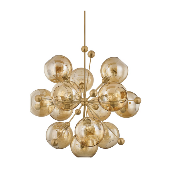 Drawing inspiration from the dynamic energy of mid-century modernism, Ellory’s specialty glass updates a timeless Sputnik silhouette. The expressive composition features a cluster of light bronze glass shades that burst from a Patina Brass frame. Smaller ornamental metal spheres add pizzazz to the maximalist array.
