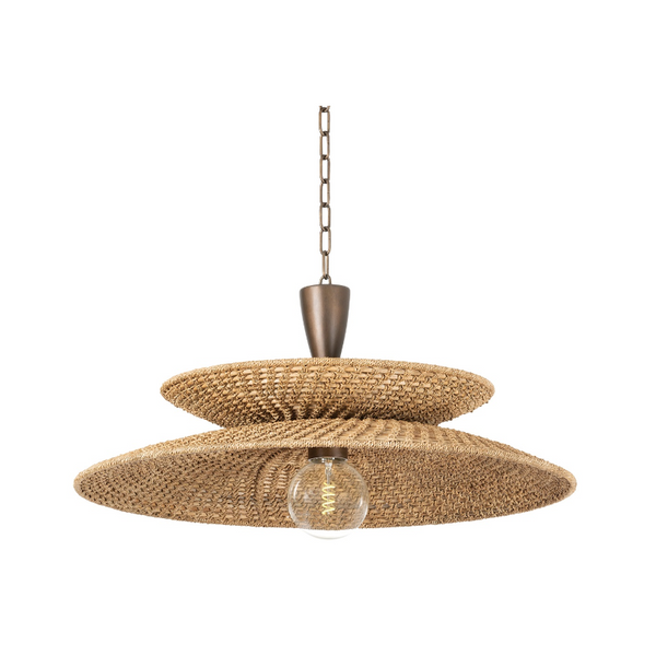 Two shallow shades are stacked in opposite directions to create the balanced artistry of this coastal pendant. The open weave of the natural abaca fiber shades allows light to filter through both sides, producing a dramatic visual effect. For the finishing touch, Landry dangles from a chunky vintage Gold Leaf chain. Available in two sizes.