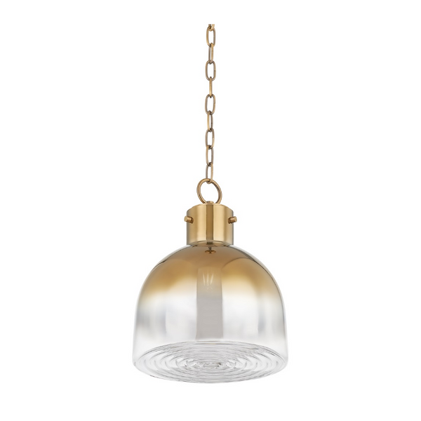 Beryl is a fresh take on industrial style—using material and texture to make it modern. Enclosed at the bottom in rippled glass, light is reflected from a lens in the neck for a beautiful, eye-catching effect. This dome-shaped glass pendant is finished in a brass-plated ombre, obscuring the light source and adding a warmth that complements the Patina Brass hardware. Available as both a large and small pendant, the smaller size can be mounted close to the ceiling.