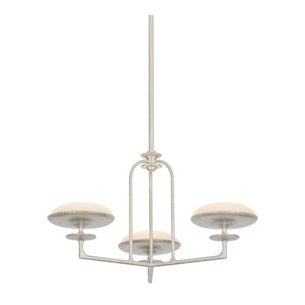 The Pacific family responds to the need for uncomplicated, yet sculptural chandeliers in contemporary interiors. A handcrafted Warm Silver Leaf finish adds texture to the geometric shapes, architectural arches, and decorative bobeches while the etched matte glass shades provide a soft diffusion of light.