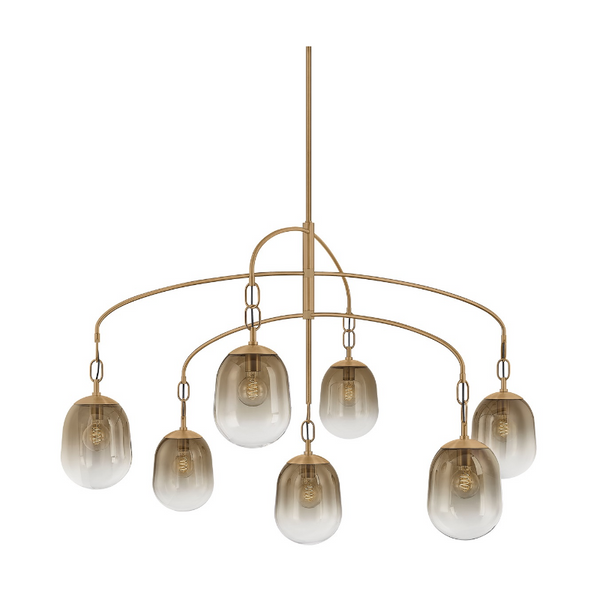 The Harvey chandelier’s dangling arms and artistic ombre glass are both Calderesque and faintly organic. Softly pill-shaped Dark Bronze glass shades drip from racetrack-shaped links on the sparse, arcing metal framework. The subtle industrial details provide a striking contrast to the otherwise playful silhouette.