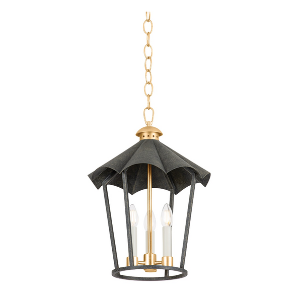 This charming lantern is a direct response to the resurgence of vintage motifs in interior design. Finished in French Iron and Vintage Gold Leaf, the slim cage exudes a timeless elegance. The retro ruffled hood receives a modern update with exaggerated peaks and valleys that feel fashion-forward and fun.
