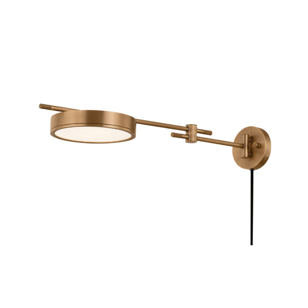 Upscale, yet highly usable, the Thatcher sconce features a striking interplay of graphic shapes. Connected by a slender arm with articulating joints, the puck-like shade mirrors the circular backplate.