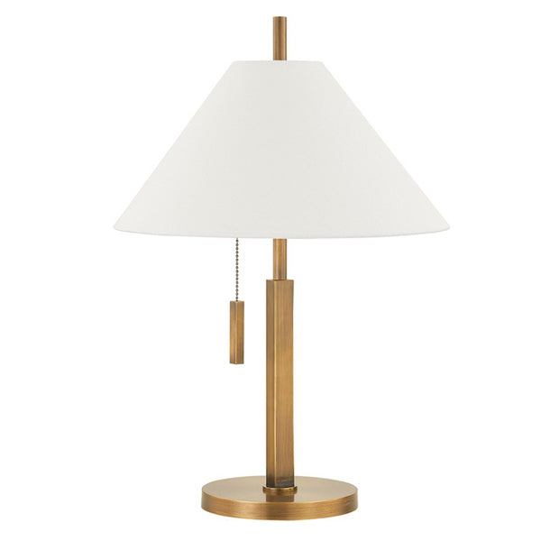 Clic is classic and tailored. An extruded square body set atop a circular base extends into a slim pole that pierces through a tapered, off-white linen shade to create a layering of simple geometry. The pull chain adds a stylish and functional detail, while the all-over Patina Brass finish contributes to the sophistication of this collection. Clic is available as a floor and table lamp.