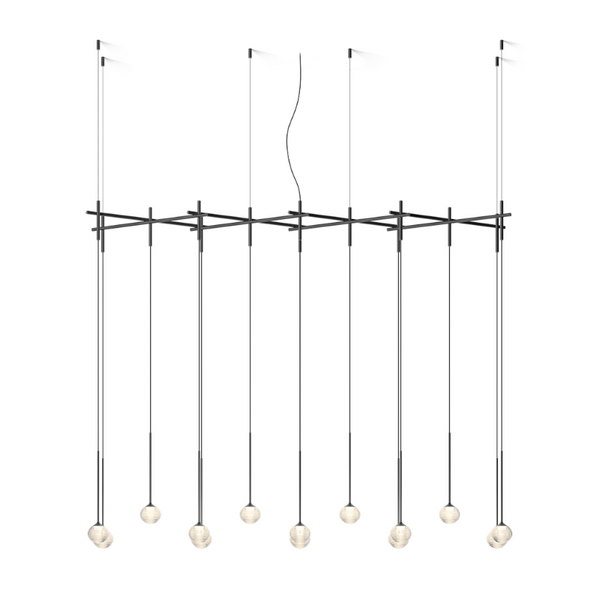 Composed of a collection of hand blown glass spheres with LED light source suspended at different heights, anchored to the ceiling via a floating tubular structure. Available with ceiling rose or built-in.