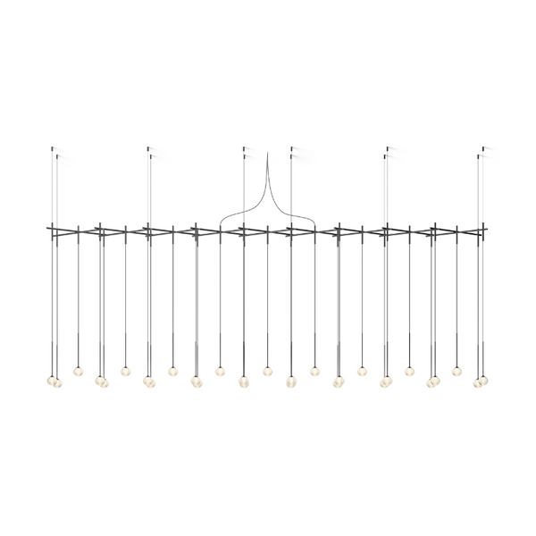 Composed of a collection of hand blown glass spheres with LED light source suspended at different heights, anchored to the ceiling via a floating tubular structure. Available with ceiling rose or built-in.