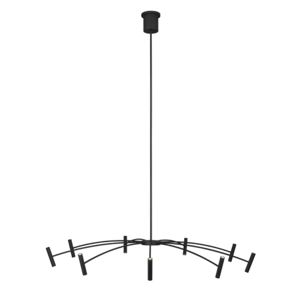 This Aerial chandelier by Sean Lavin for Tech Lighting features symmetrically spaced arched rods supporting a ring of slim cylindrical heads. The cylinders produce up and down illumination while concealing the integrated LED light sources. Offered in Matte Black. A great piece to coordinate with the smaller scale Aerial chandelier in your open living space, dining area and foyer.