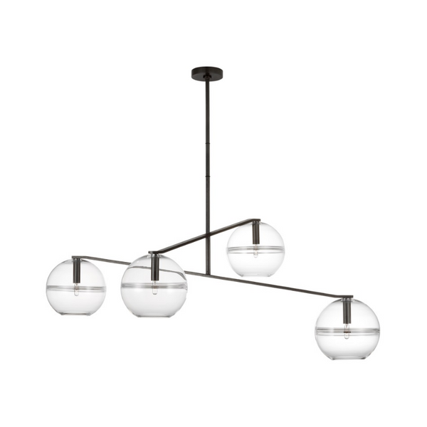 The Lowing Medium Chandelier by Sean Lavin is best described as a deconstructed modern chandelier, where glass orbs are each suspended from the sleek branchlike central hub via contrasting textured cloth-covered cords to make a distinctly alluring visual statement. While each transparent clear glass orb is perfectly spherical and smooth on the exterior surface, the interior surface features gradually thickening bands of glass artfully crafted by talented artisans to add alluring visual interest and dimension to your space.