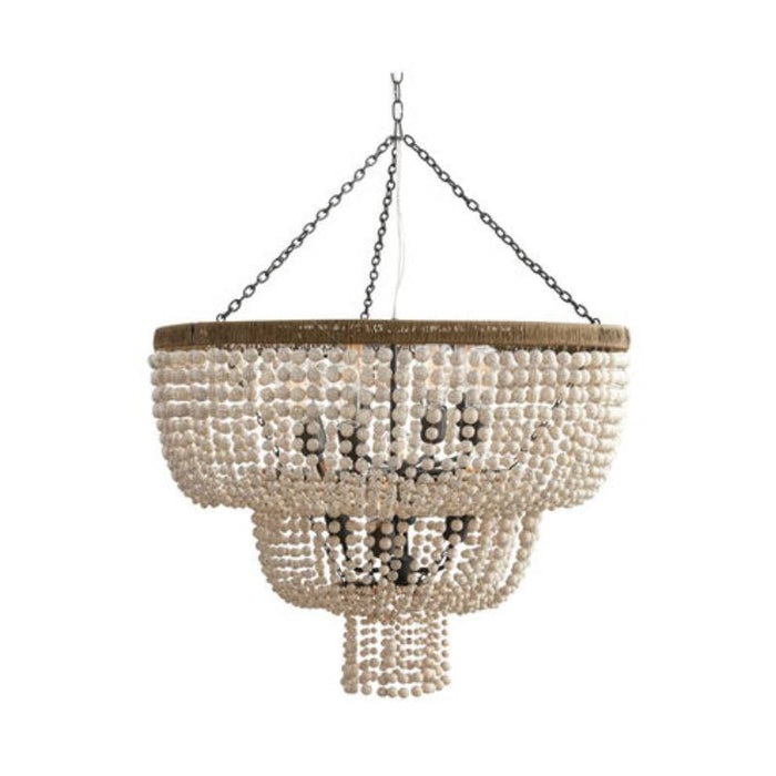 While this 12-light chandelier bears a traditional form, artisan features make it much more eclectic. Swags of graduated ivory crackle resin beads are draped over an iron framework that is wrapped in antique brass wire.