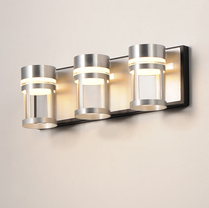 Machined blocks of Brushed Aluminum house LED modules which project light through a clear acrylic diffuser and down to the surface below. Laser cutout tubes below wash with light and add character to this unique vanity design. A black edge along the back adds interest to the clean design.