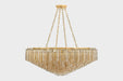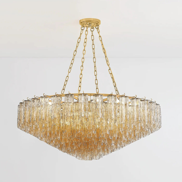 The incredible quantity of layers, lights, and complex glass shapes make Watertown a dramatic showstopper. Inspired by Art Deco aesthetics, this maximalist chandelier features organically shaped Tronchi glass shades with textured cuts. The shades are arranged to form a descending point at the center, reminiscent of water droplets.