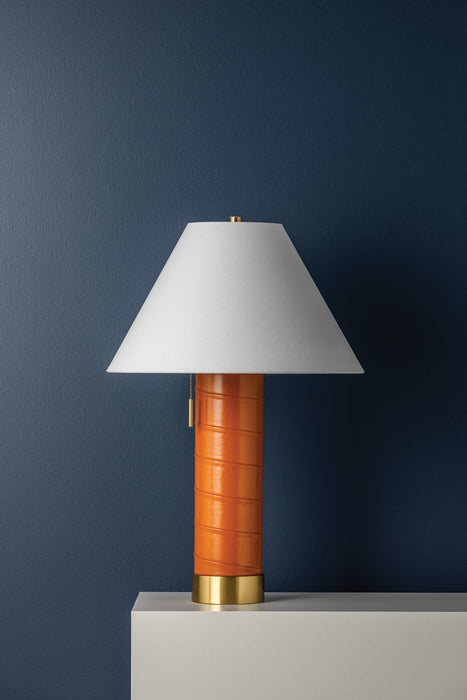 A celebration of heritage, this table lamp is a charming bedside or desk companion. The tactile leather-wrapped body brings a sense of old-world nostalgia achieved through fine craftsmanship. Topped with a tapered white linen shade and finished with an elegant Aged Brass pull switch and base, Norwalk creates a refined lighting experience.