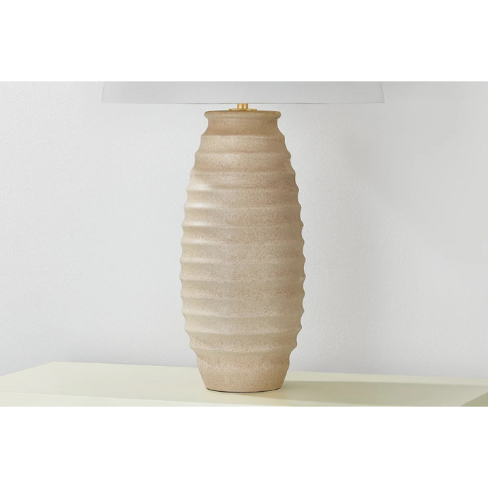 Bringing a fresh-from-the-studio feel to modern interiors, this evocative table lamp features a ceramic base with deep, organic grooves. Reminiscent of terracotta, the sculpted base is a testament to the skillful artisanship behind the piece.
