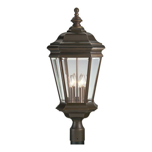 Progress LightingFour-light cast post mount lantern with clear beveled glass. Features Finish: Oil Rubbed Bronze Glass: Clear Beveled Material: Die-Cast Aluminum ...
