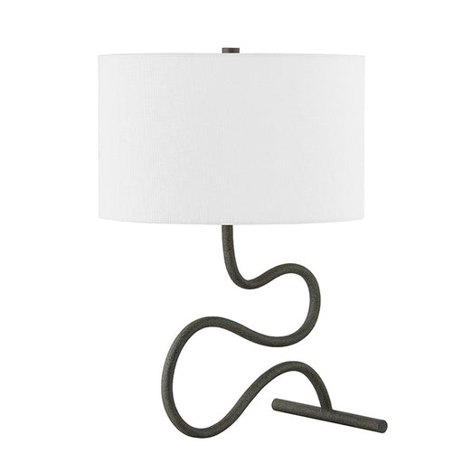 Troy LightingA sweeping piece of forged French Iron forms the slender curved body of this sculptural table lamp. Pairing it with a traditional drum shade in off...