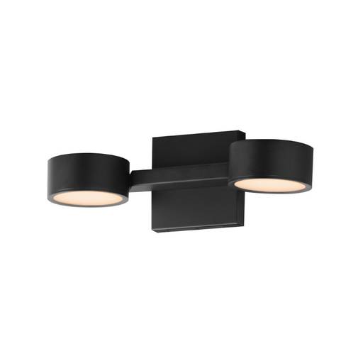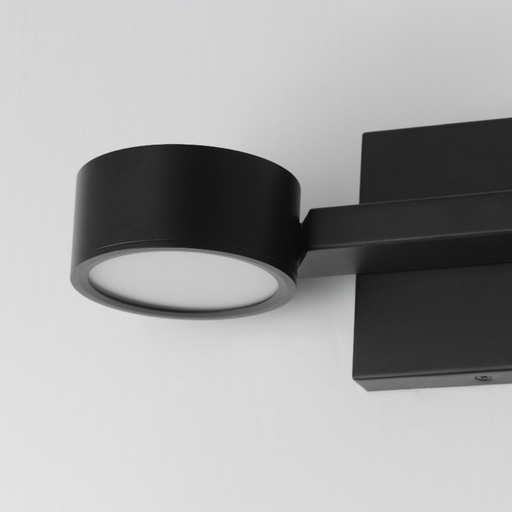 ET2A modern matte black frame crafted with rectilinear tubing supports circular LED light modules. Designed to appear as if they are facing each other...