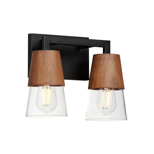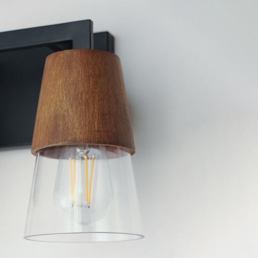 Maxim LightingCapped by wood finished in Walnut, this series of bath vanity sconces feature conical Clear Glass shades. Contrasting Matte Black frames of squared...