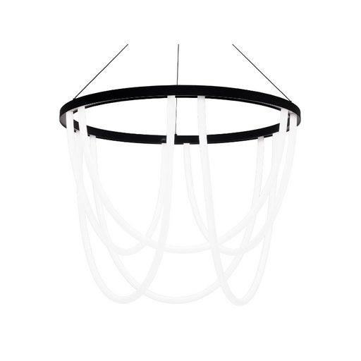 DWELEDLike a tornado whirling in space, multiple curves of illumination are backed by a black frame and suspended from a cloud-like canopy. Integrated LE...