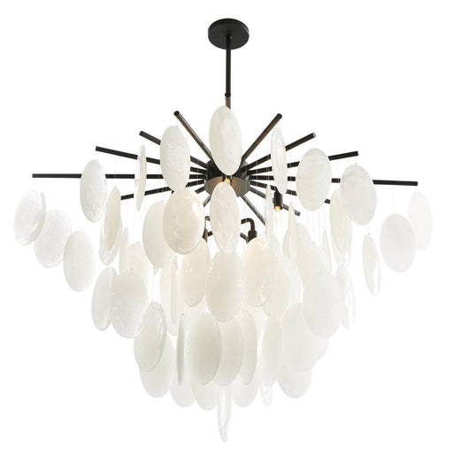 ArteriorsThis eight-light chandelier is slightly whimsical. Frosted, seedy glass discs bring a modern feel to this stunning wind chime design. A blackened i...