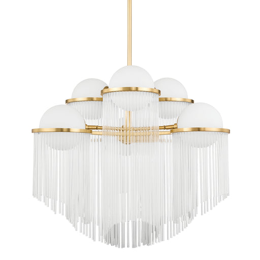 Corbett LightingWith an old Hollywood aesthetic, Celestial pays homage to the stars. Angled glass rods rain down from aged brass rings that encircle opal matte glo...