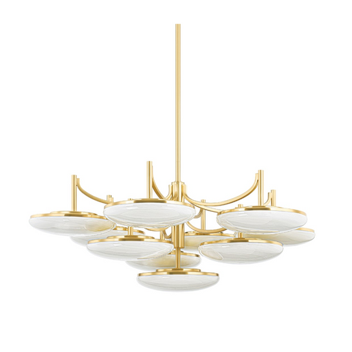 Hudson ValleySlender, disc-like cloud glass shades are capped in Aged Brass and clustered around the center at varying heights for a slim, modern silhouette tha...