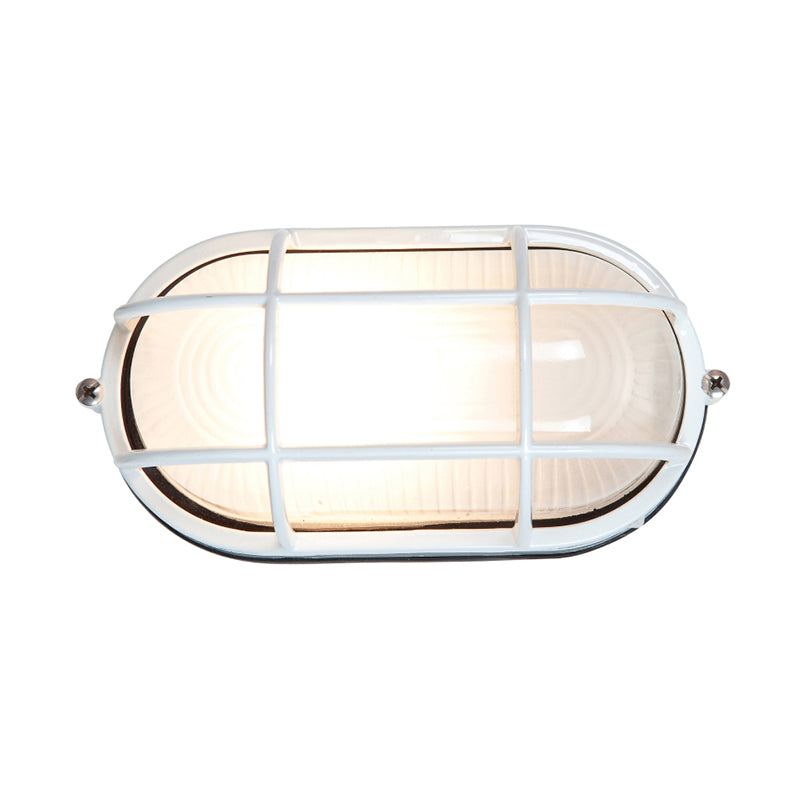 Wet location bulkhead in black, satin or white finish with frosted glass diffuser.