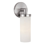 Contemporary candle inspired wall fixture with opal glass and brushed steel finish