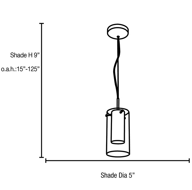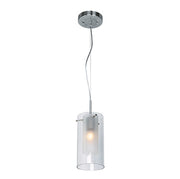 Cylindrical pendant with clear outer glass and frosted inner glass diffuser, suspended with clear cable in a brushed steel canopy.