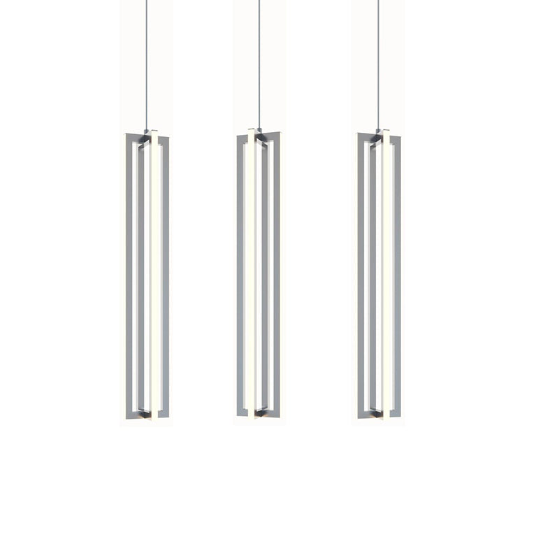 Contemporary 3 light LED linear pendant with four sided illumination.