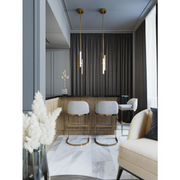 This pendant features three-sided illumination with a white acrylic diffuser.