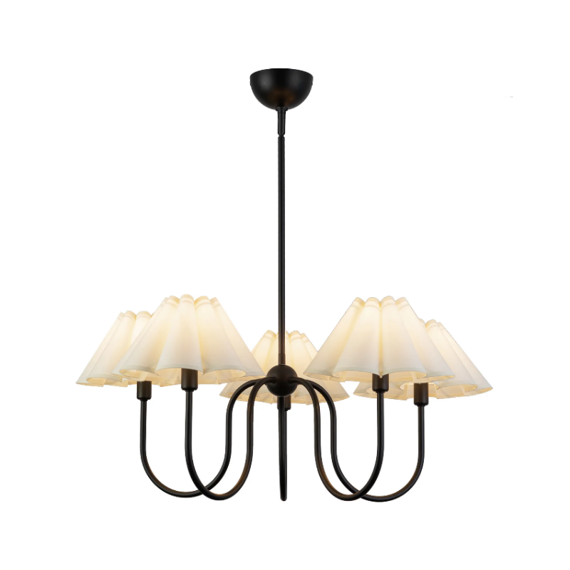 Give your home a magical makeover with the Rosemary chandelier from Kelsey Leigh Design Co. Imagine this: oversized pleated linen shades that make your space feel like a vintage market treasure. It's a timeless piece that adds a touch of elegance and warmth to any room.