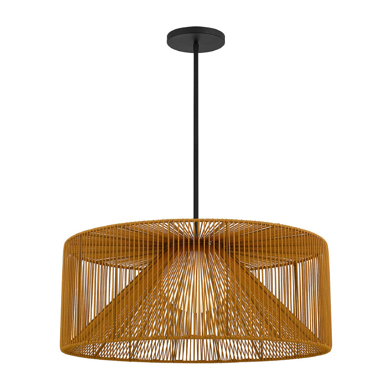 The Key West Double Inverted Woven LED Pendant blends upscale modern design with the organic charm of weather-resistant rattan, enveloping a glowing glass globe that casts a warm, inviting light.