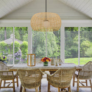 The Aruba Pendant features a finely crafted woven weather-resistant rattan design, paired with an etched opal glass globe for a soft, inviting glow. Its modern yet natural aesthetic brings a relaxed sophistication to any space, making it ideal for both coastal-inspired and eclectic interiors.