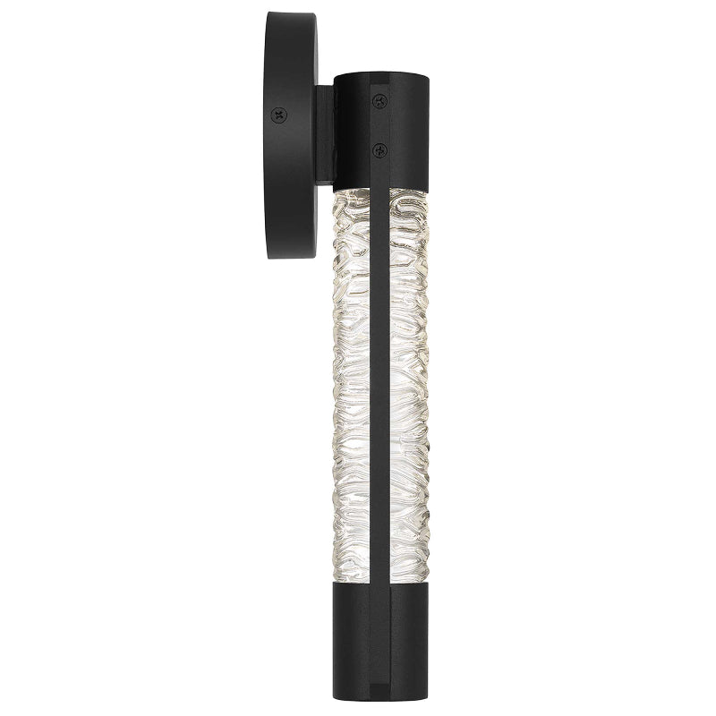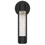 The Tig LED Wall Sconce, when lit, transforms its surroundings with the stunning pressed water-patterned glass, casting a captivating mottled effect on the wall that radiates warmth and charm.