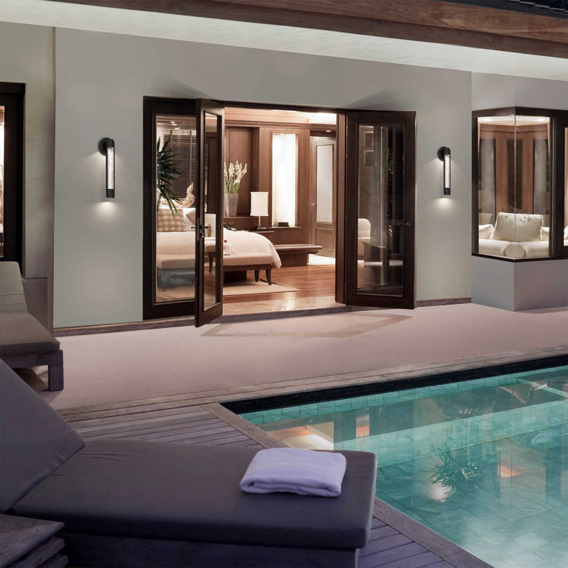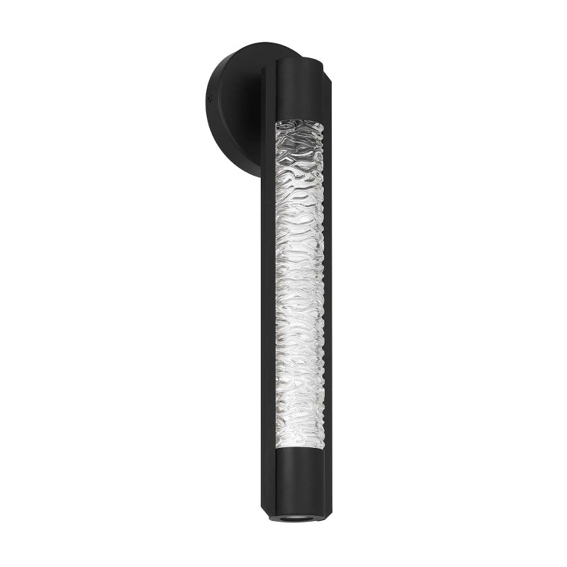 The Tig LED Wall Sconce, when lit, transforms its surroundings with the stunning pressed water-patterned glass, casting a captivating mottled effect on the wall that radiates warmth and charm.
