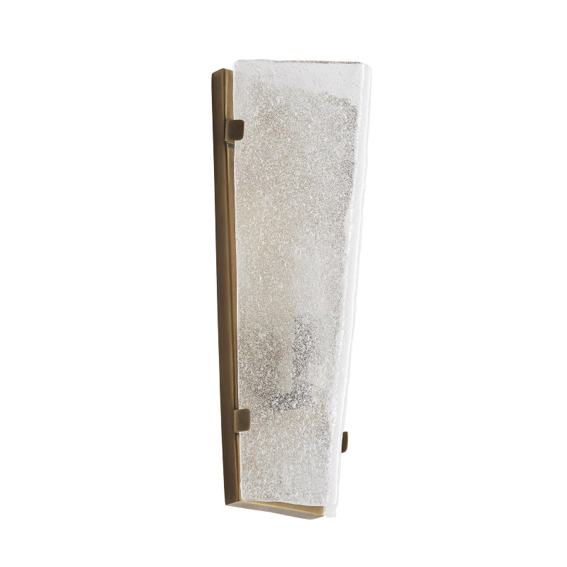 The Karina Sconce's seedy glass shade combines with its antique brass-finished steel backplate to a wholly unique and warming glow. The form and finish of the shade almost resemble a carved piece of granite.