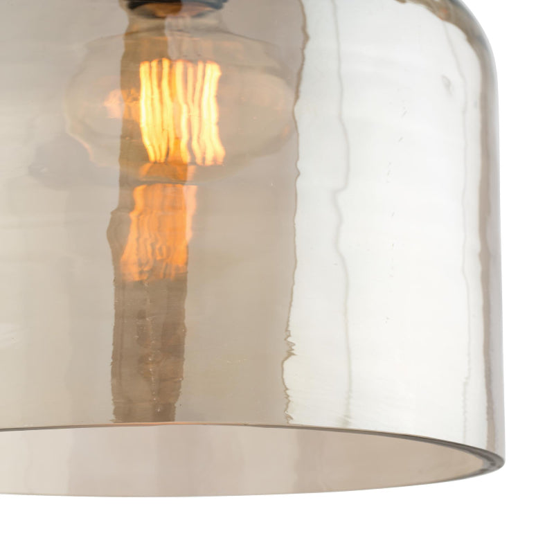 This one-light glass pendant has a taupe cloth cord and a simple round vintage brass canopy. The glass is a beautiful smoky color with a luster finish that creates a warm glow when lit, making it a great powder room fixture. Taupe cloth cord. Shown with a Nostalgic thread bulb.