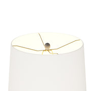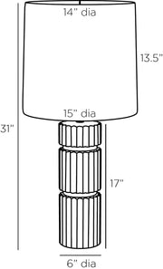 Sculpted in ceramic and finished in a ocean-reactive glaze, the Annika’s textural fluting is reminiscent of mechanical gears. Accented with an antique brass finished support and an off-white linen drum shade, it delivers the perfect marriage of industrial and modern design. Matching ocean ceramic finial, clear silver cord, and three-way rotary switch. Finish will vary.