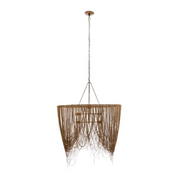 Cascading swags of fine brass chain in antique brass and nickel finishes make this chandelier a dramatic addition to any space. The uneven ends of the delicate chains add to the decadent elegance. Each piece is handmade and will feature slightly different chain placement as well as varying finishes. Shown with Nostalgic spiral radio bulbs. Damp-rated, although limited covered outdoor areas may affect finish.